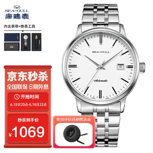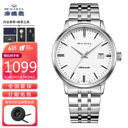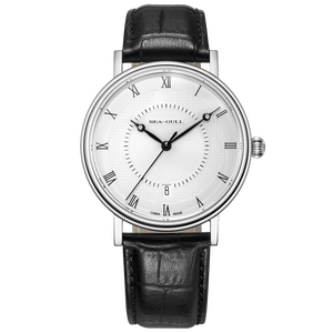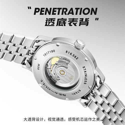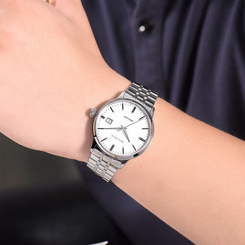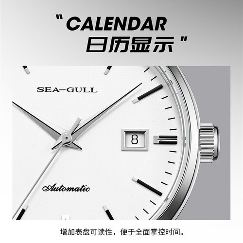 海鸥的这款手表,也在表盘上开了一个小窗口用于日历的显示。而它的表盘、表壳和表带无时无刻的透露着商务范,彰显气质。