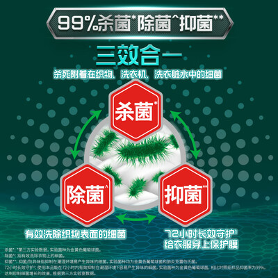 蕴含有纳米级洁净抗菌因子,强力渗透层层织物障碍,深入衣物纤维有效去除深处的细菌脏污,实现三效合一的洗涤效果,呵护家人的衣着健康。