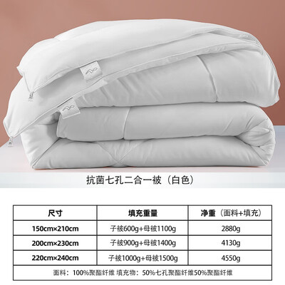 二合一的子母被设计一年四季都能用,亲肤磨毛面料让人爱不释手;被角八点定位绑带,稳固被芯不滑移,内部七孔纤维填充清爽睡眠。