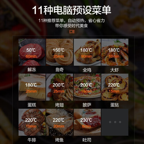 高清LED屏,可实时显示腔内温度和预设温度,方便掌握火候。M型双烤管增大加热面积,受热更均匀。搪瓷易洁内胆,清洁方便。