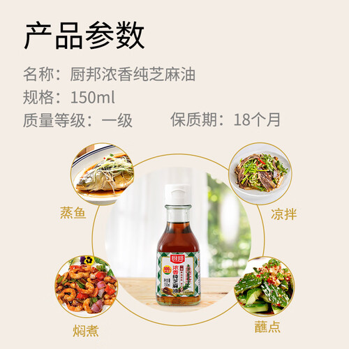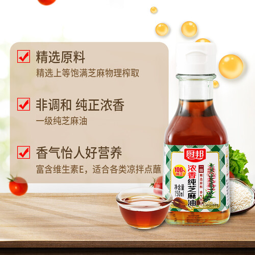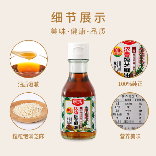 选用颗粒饱满的芝麻为原料,经过物理压榨工艺制成,使其油质更澄澈,味道香醇自然不油腻,给你带来浓烈的芝麻香气。