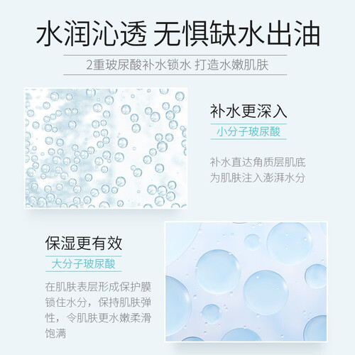 小分子玻尿酸,能柔软湿润肌肤,提升肌肤水分和锁水功能。维生素E等滋养成分,能补充肌肤营养缓解干燥,滋润保湿肌肤。