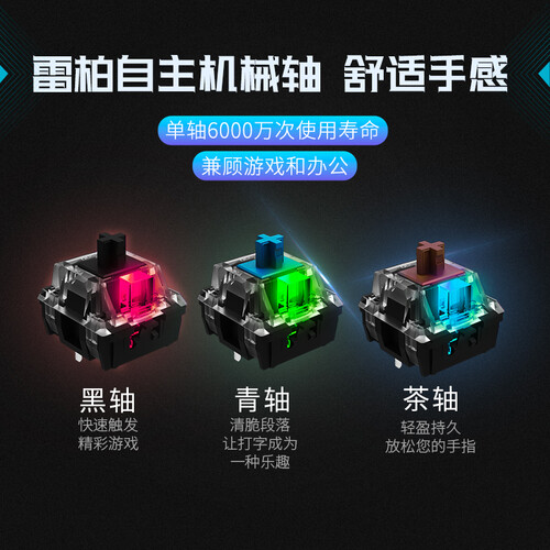 RGB炫彩灯光,可自定义多种展现方式,满足游戏、上班不同场景使用。双色注塑悬浮背光键帽,耐磨损性能好,字体不易褪色。