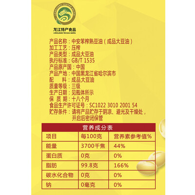 这款食用油精选东北黑土地养育的非转基因大豆为原料,采用物理压榨工艺精细加工而成,香味浓郁,口感纯正,烹饪鲜香可口。