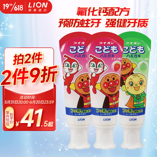 2支草莓味+1支哈密瓜儿童牙膏,味道清新香甜,在刷牙后可保持口腔持久清新,膏体为食品级材质,安全可吞咽,宝宝误吞也没事。