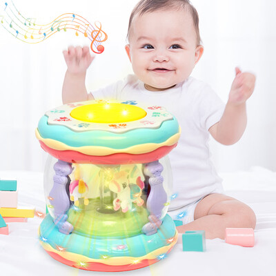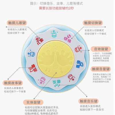 鼓面凹凸纹理设计,在触摸拍打的过程中,可以锻炼手部力量。可外接手机播放音乐,可以让宝宝听到更多的早教内容和音乐。