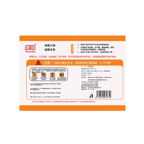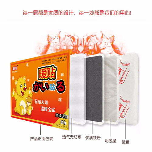 暖咖暖宝贴优质铁粉,含铁性高,发热快且均匀。透气无纺布,散热均匀,发热时间长。背胶粘性强,运动也不脱落,不伤衣物。