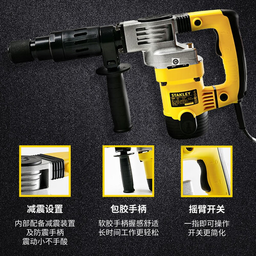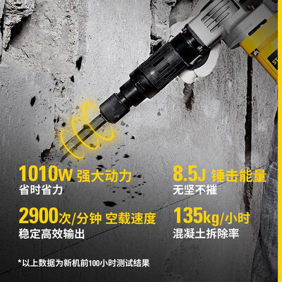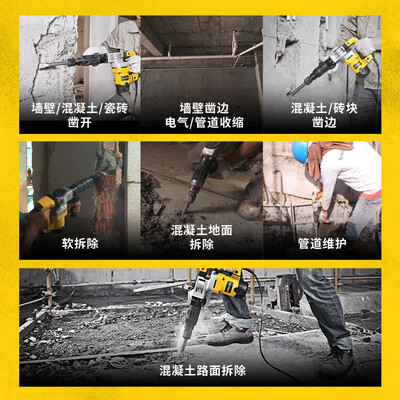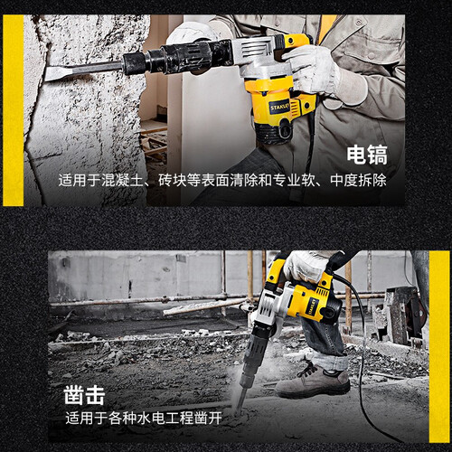 混凝土、砖块等表面清除和中度拆除,使用电镐模式;各种水电工程凿开,使用凿击模式。2900次/分钟空载速度,稳定高输出。