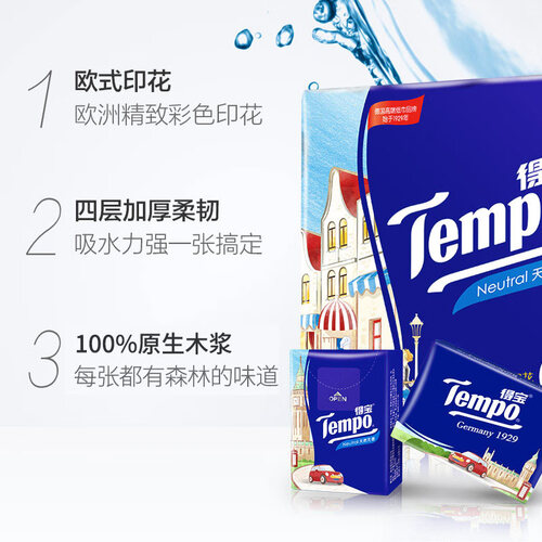 充满欧式风情的印花包装,别具一格更有特色,四层加厚设计,柔韧性能升级不易破;进口原生木浆材质,不掉纸屑不尴尬。