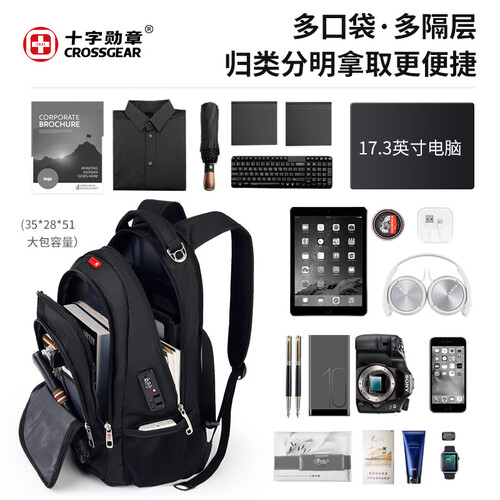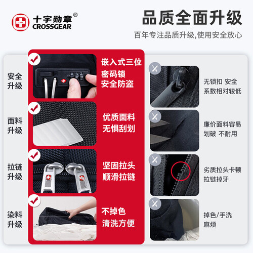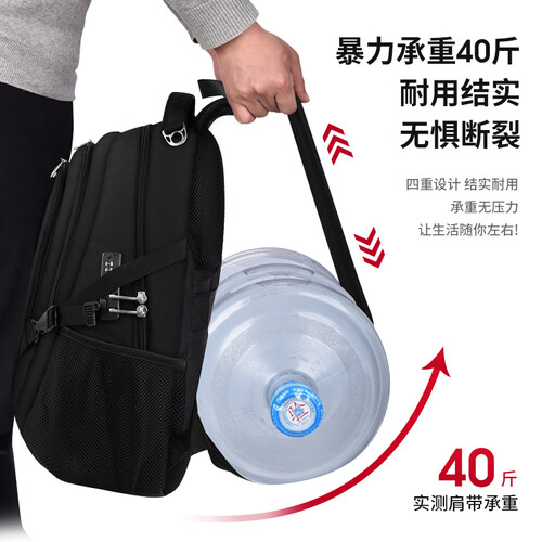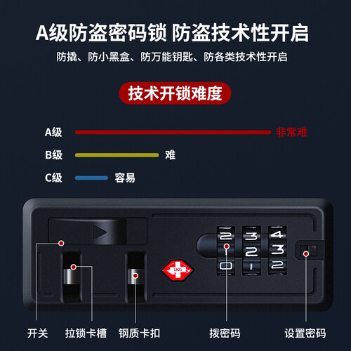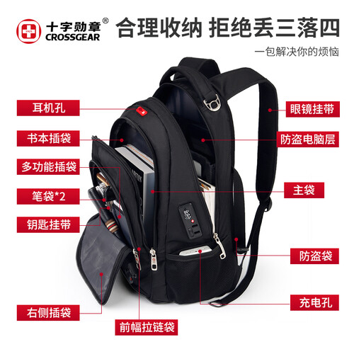 三大隔层,大容量,安全防盗,科学收纳系统。一键解锁简单操作,保障包内物品安全。隐藏式USB充电接口,即插即充电。