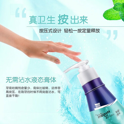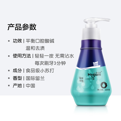 按压式设计,取量更精准,干净卫生使用方便,膏体细腻,有效避免二次污染;小苏打微粒颗粒,调节口腔酸碱度,安全洁白牙齿。