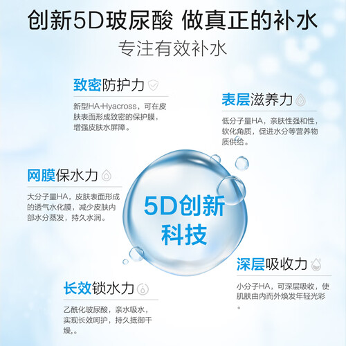 添加了神经酰胺成分,能够增强肌肤的角质层,肌肤更加健康。而且还蕴含了5D玻尿酸成分,带来立体的补水效果。