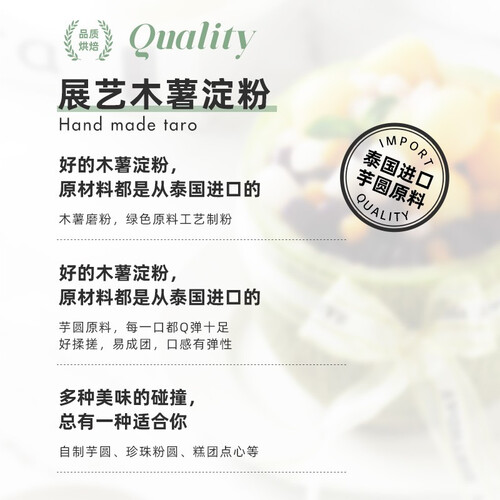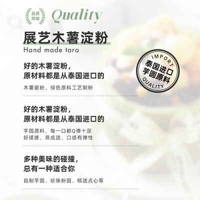 搭配五种果蔬粉,能够做出多种口味的芋圆,木薯磨粉,是绿色品质原料,并且制作很轻松,易揉成团,做出来的芋圆软糯弹润。