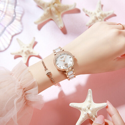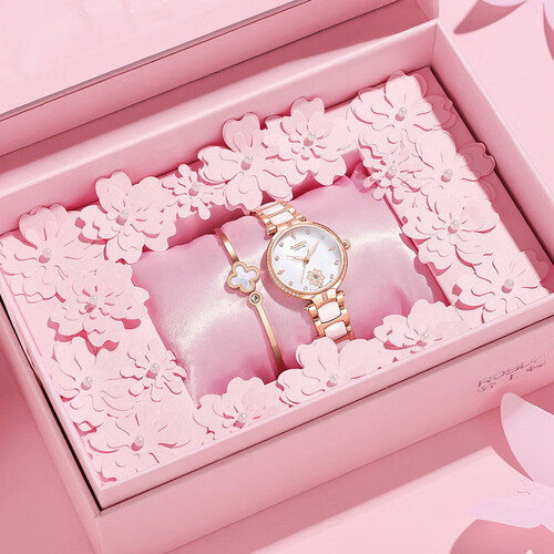 盘面印花的设计,增加了女性的柔美感,更显优雅温柔。弧度双按扣,佩戴便捷。表盘上简约的印花,于细节处勾勒品质,精致可爱。