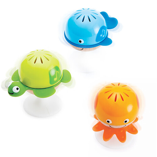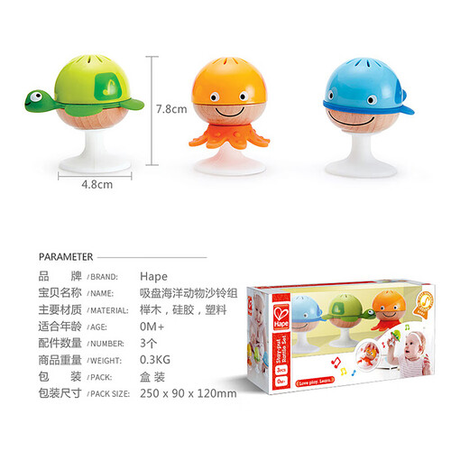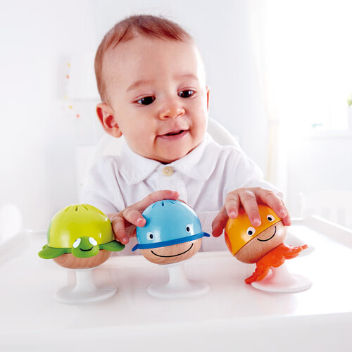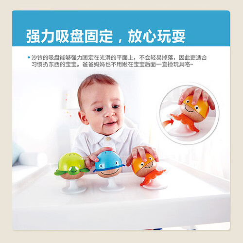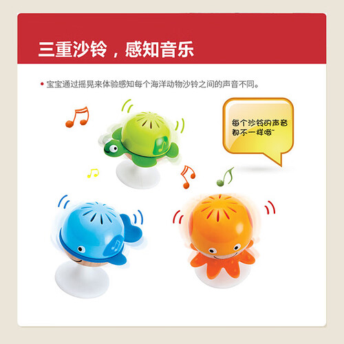 底部的吸盘设计,可以固定在某一个位置,方便宝宝玩耍。通过摇晃发出声音,让宝宝感知不同海洋生物的声音变化。
