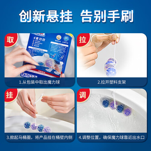 创新的悬挂式使用方式,使用不伤马桶釉面。萃取薰衣草精华,清洁的同时释放出香气,有效去除异味,保持空气清新。