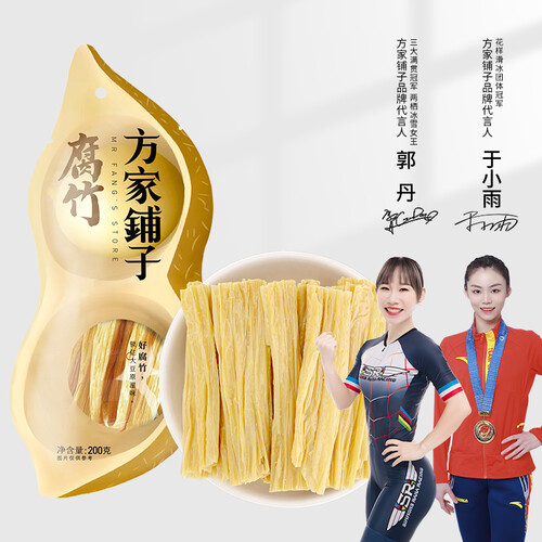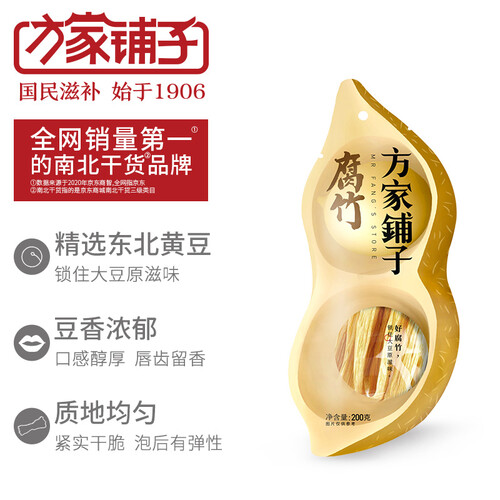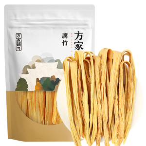 这款方家铺子豆香味腐竹,选用大豆原浆作为原料,外表颜色金黄诱人,质地轻盈,口感软韧香浓。