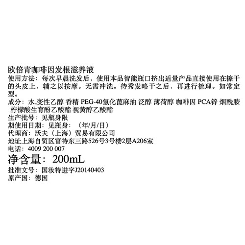 咖啡因复合物2分钟便能直达头皮激活发根,营养直达根部,延长发根活跃周期。薄荷醇成分有效去除油脂污垢,营造健康头皮环境。