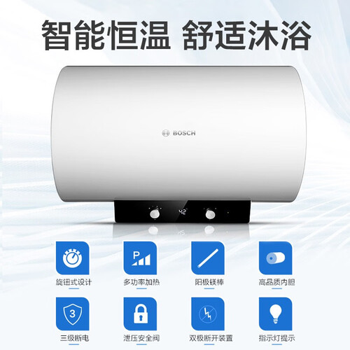具有3种功率设计,可以根据日常需求选择,适用大多数家庭电路。还配置了钢芯阳极镁棒,能够净化水质,防止水垢产生。