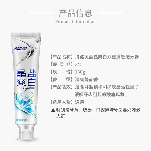 蕴含抗敏感活性因子,持久呵护敏感牙齿,帮助对抗牙本质敏感;蕴含晶盐精华,深层清洁口腔,洁白牙齿,增强口腔健康。