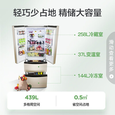 多格局空间,方便使用者分类摆放食材,同时也便于使用者快速找到食材。冷光源照明,亮度柔和,避免眼睛出现不适感。