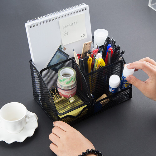 多功能收纳笔筒,大空间收纳,7格分类,易于摆放。金属铁网,结构稳固,表面平滑不伤手。喷漆防锈,不易褪色。
