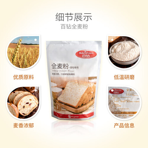 全麦面包粉,麦香浓郁,制作出的面包有嚼劲。饱腹无负担,你的健康之选。