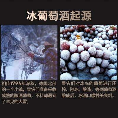对冰冻的葡萄进行压榨、除冰,精心酿造而成,冰酒口感甘美爽冽,酸甜适度,同时具有浓郁的多种果香,清新怡人。