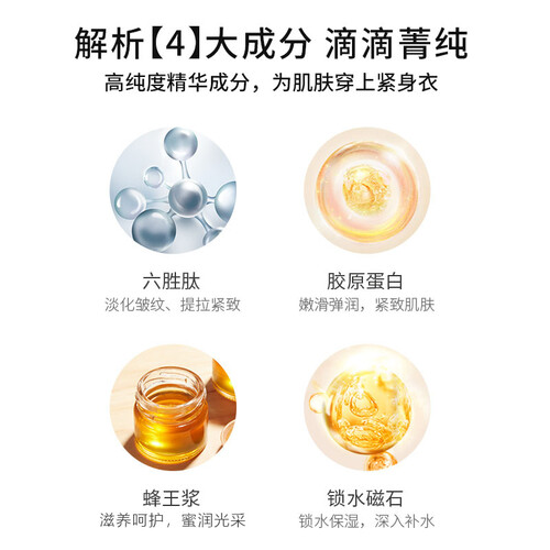 加入六胜肽精华,抚平肌肤细小纹路,修护岁月留下痕迹。含有植物精粹成分,为肌肤注入充足水分,维持水润透亮的状态。