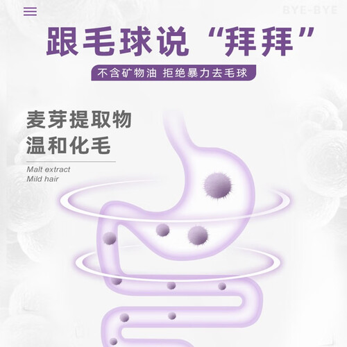 膏体口感香浓细腻,适口性高,可有效减少爱宠抗拒心理。进口膳食纤维,促进猫猫肠道蠕动,促进体内毛球排出体外。