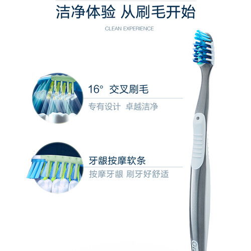 采用16°交叉刷毛设计,能深入齿缝清洁,将死角一并清洁干净;配备牙龈按摩软条,舒适按摩牙龈,不会刺激到敏感人士的口腔。