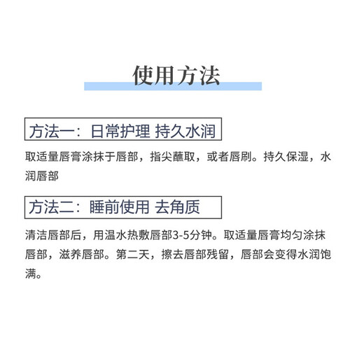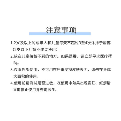 蕴含有蜂蜡提取物,能够有效呵护娇嫩的双唇,让唇部肌肤持久水润。含有蓖麻油提取物,能够帮助维持唇部的滋润。