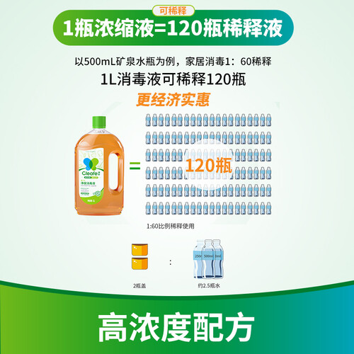 核心成分季铵盐消毒杀菌效果好,高浓度液体稀释后使用经济实惠;水溶配方易漂易清无残留,带有天然松柏淡香,开启一天好心情。
