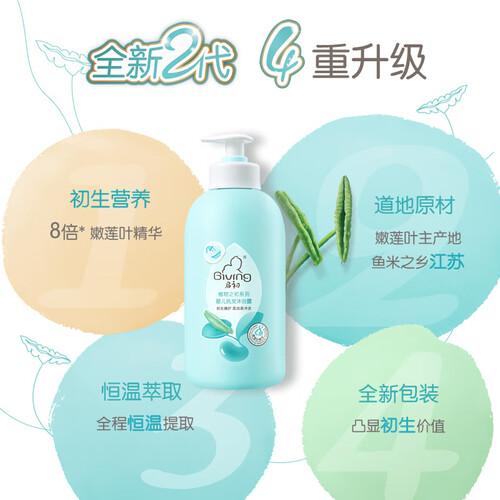 选用初生嫩莲叶精华,温和配方洗头沐浴均可,无泪不伤眼睛,混含丰富氨基酸营养群,呵护娇嫩肌肤,柔顺宝宝头发。