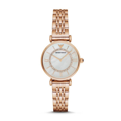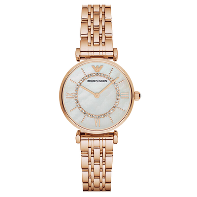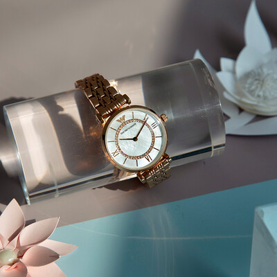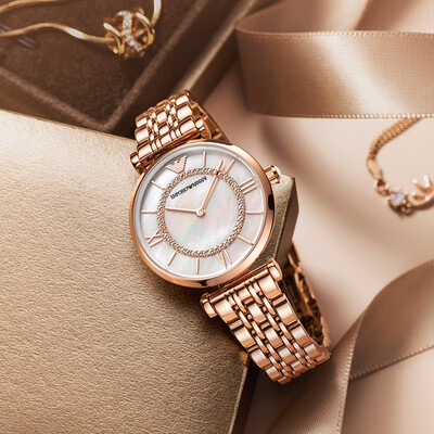 阿玛尼的这一款女士腕表,选用珍珠母贝的表盘,简约整洁,搭配金属表带,可细腻贴合手腕,低调展现轻奢范。