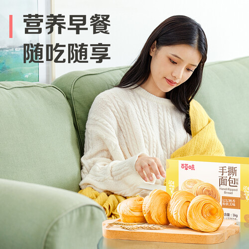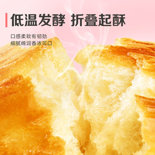 具有多道层次,撕开后面包的纹理清晰,蓬松柔软,富有嚼劲。采用低温发酵,慢慢激发原材料的奶香味道,食用舒心。