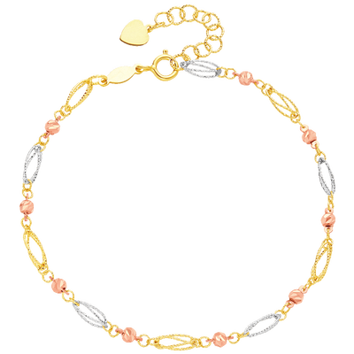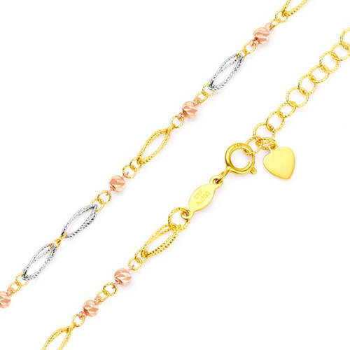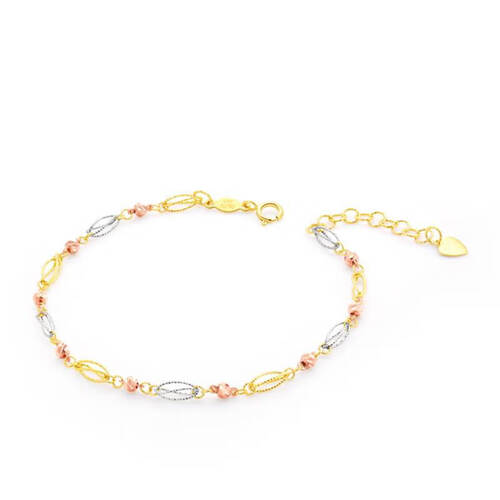 这款三色K金手链,搭配立体车花工艺,时尚易搭加分个人魅力。可调节延长链设计,从容勾勒出纤细皓腕,彰显优雅大方气质。