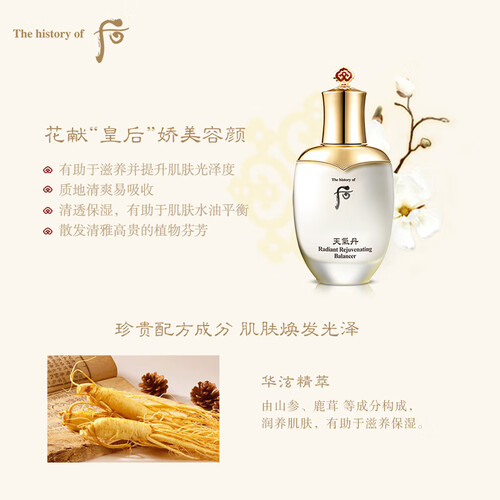 爽肤水中含有山参、鹿茸等珍贵成分,能够为肌肤带来有效滋养,同时补水保湿改善肌肤的紧绷干燥情况。