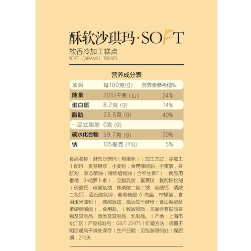 甄选全蛋液、全脂乳粉和小麦粉等食材匠心配比,精心烘焙出来的沙琪玛软糯香甜,好吃又不粘牙,浓浓的蛋香味令人回味久久。