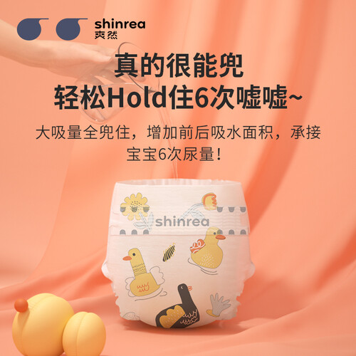 爽然轻薄婴儿纸尿裤,3mm轻薄吸收芯体,海量高分子吸收树脂,瞬吸并强效锁住尿液,不用担心宝宝尿湿裤子,轻松透气不闷屁屁。