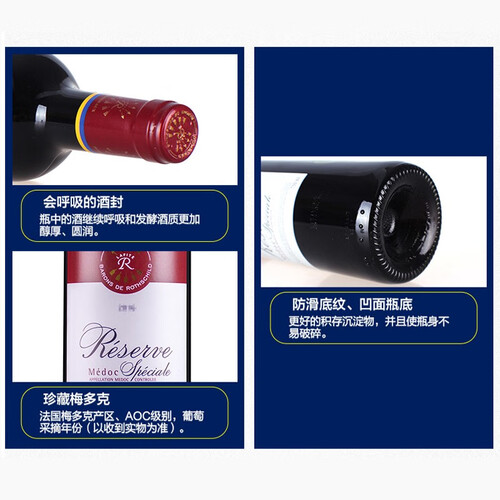 精致酒封设计,瓶中的酒会继续呼吸和发酵,酒质会更醇厚圆润。防滑底纹凹陷瓶底,更好的积存沉淀物,瓶身不易破碎。