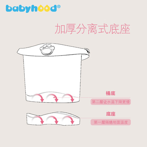 加厚桶壁,让桶内的水与外界温度接触较慢,保温效果更好,宝宝洗澡更舒适,加厚分离式双重底座,双重隔温。