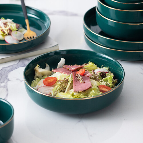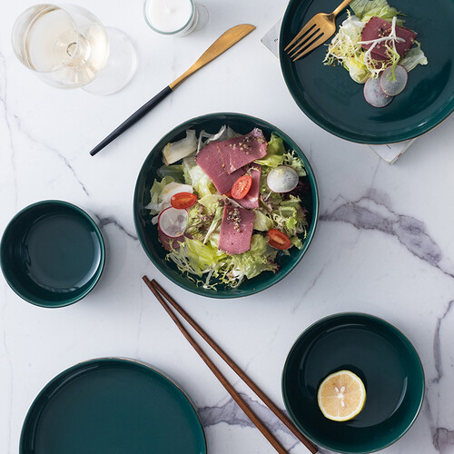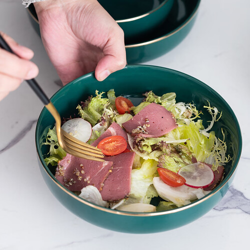 轻奢手绘金边碰撞复古孔雀绿色,端庄古朴又不失温柔浪漫;釉面光滑触感细腻,易于清洁久用如新,高温烧制的陶瓷质地坚硬更耐用。