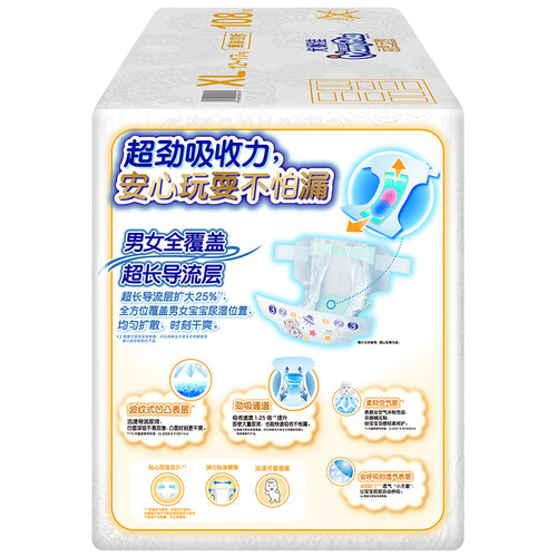 超长导流层,全面覆盖全吸收,均匀扩散尿液;高压空气冲制的云柔空气表层,如云般轻抚娇嫩小屁股;超柔弹力腰围,舒适不紧勒。