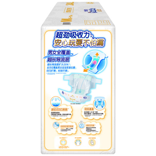 劲吸双通道快速瞬吸,尿量再大屁屁也能保持干爽;超长导流层,全面覆盖全吸收,均匀扩散尿湿;超柔弹力腰围,舒适不紧勒。