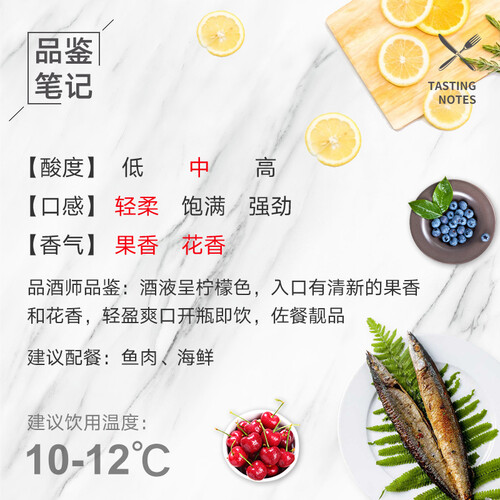 甄选西班牙白葡萄酿造而成,酒体清澈透明,陈香浓郁,入口清爽淡雅,酸度适中,不会有辣喉刺激感。可搭配鱼类、海鲜与餐前小吃。