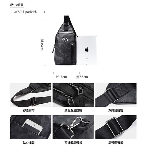 采用迷彩元素设计,彰显时尚潮流。字母M点缀包身设计,让你高辨识度出街。
