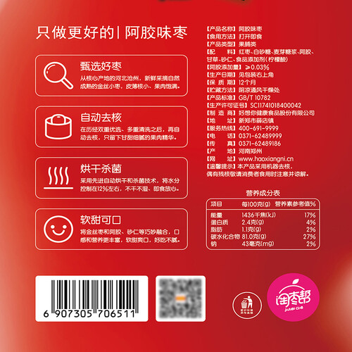 精选河北沧州金丝小枣,搭配阿胶、甘草等制成,甜而不腻,软糯筋道。