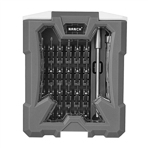收纳盒根据工程学设计,提供更好的收纳效果,批头不易移位。全铝合金磁性吸附手柄,自动吸附,方便更换批头。