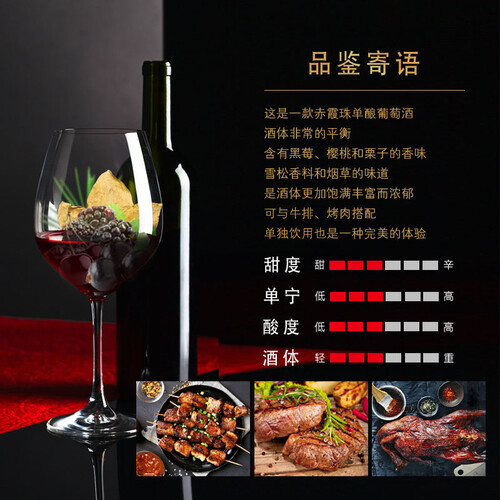 赤霞珠单酿葡萄酒,含黑莓、樱桃和栗子的香味,酒体饱满,口感浓郁,即使单独饮用也独有风味。